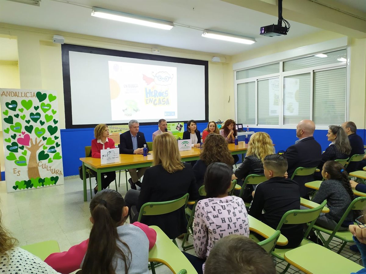 El delegado de Salud y Familias de la Junta de Andalucía, Juan de la Cruz Belmonte, junto al delegado de Educación, Deporte, Igualdad, Políticas Sociales y Conciliación, Antonio Jiménez, han presentado en el CEIP Ángel Suquía el programa 'Héroes en casa' que llegará a 3.700 escolares.