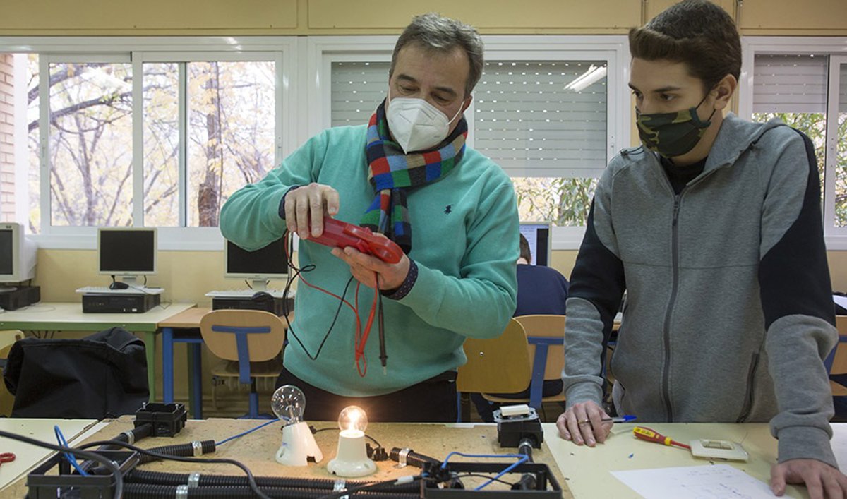Archivo - Un alumno y un profesor de FP durante una clase práctica