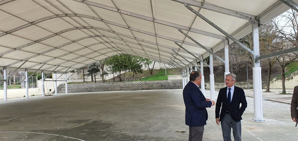 La segunda de las intervenciones finalizadas en el IES Aguilar y Cano de Estepa, que ha supuesto una inversión de 149.497,24 euros, ha consistido en la dotación de sombra a una de las pistas polideportivas. Para ello se ha colocado, en la pista más cercana a la salida del instituto, una estructura metálica con pilares recubiertos de material protector de goma espuma y cubierta de lona de poliéster. Esta actuación proporcionará al alumnado del instituto una nueva zona de sombra y protegida de las inclemencias.