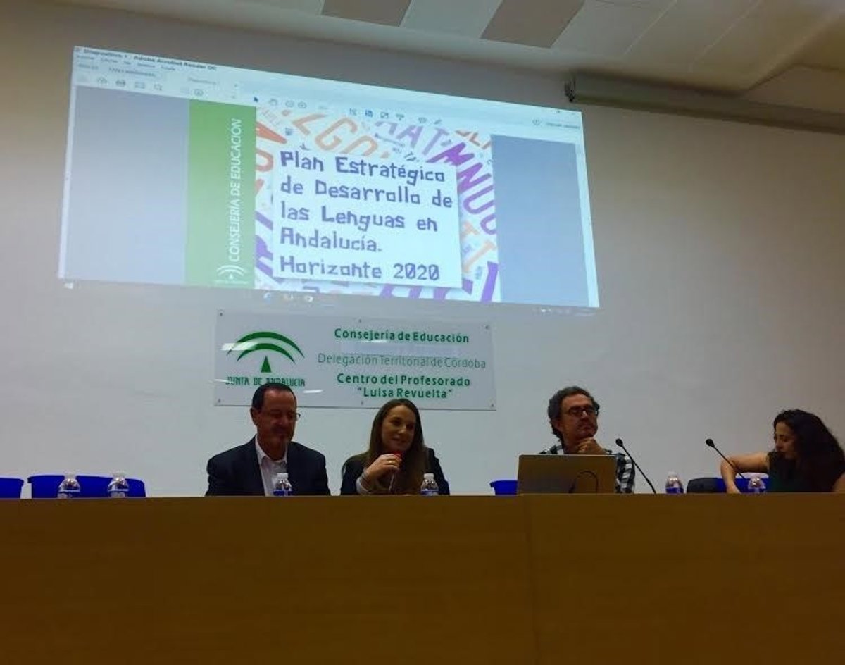 El director general de Innovación de la Consejería de Educación, Pedro Benzal, junto a la delegada de Educación de la Junta en Córdoba, Esther Ruiz, y la jefa de servicio de Programas Internacionales, María Luisa Ochoa, ha presentado este miércoles en Centro de Profesores de Córdoba Luisa Revuelta el Plan Estratégico de las Lenguas en Andalucía. Horizonte 2020 (Plan Pedla), que tiene como objetivo la extensión gradual del aprendizaje obligatorio de dos lenguas extranjeras hasta la Educación Secundaria, la mejora de la formación del profesorado y el adelanto del estudio de un idioma no materno al segundo ciclo de Infantil.