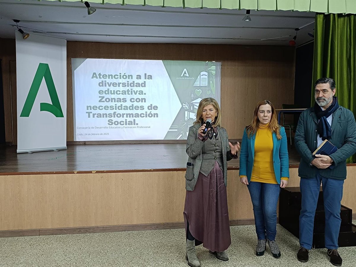 La directora general de Participación e Inclusión Educativa de la Junta de Andalucía, Almudena García Rosado, ha visitado este lunes el CEIP Gadir en Cádiz para presentar el programa para la atención educativa en Zonas con necesidades de Transformación Social (ZTS) y las actuaciones educativas para el alumnado en situación o riesgo de vulnerabilidad.