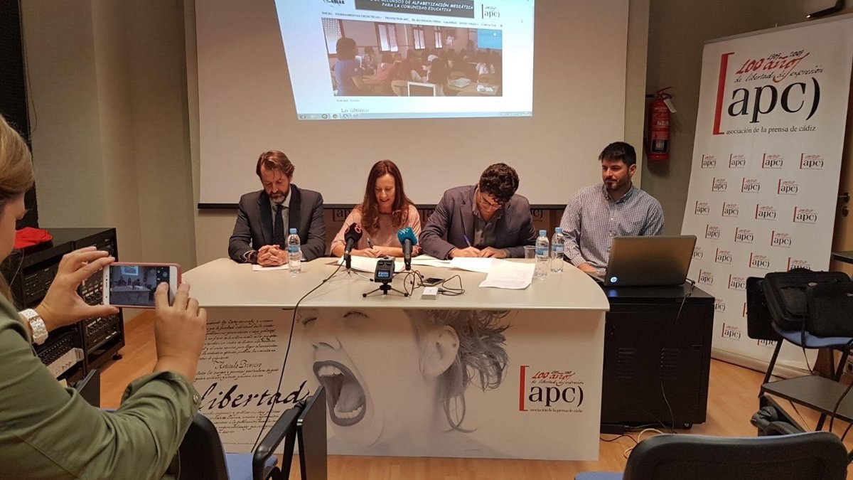 Este acto, en el que también ha estado presente el director del área de negocio de Caixabank en Cádiz, José Luis Llerena, entidad que participa en la financiación de estos programas junto con la Consejería de la Presidencia, ha servido para presentar, además, el nuevo portal de recursos educativos 'Periodismo en las aulas' para complementar el programa de charlas y talleres.