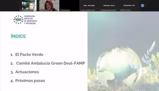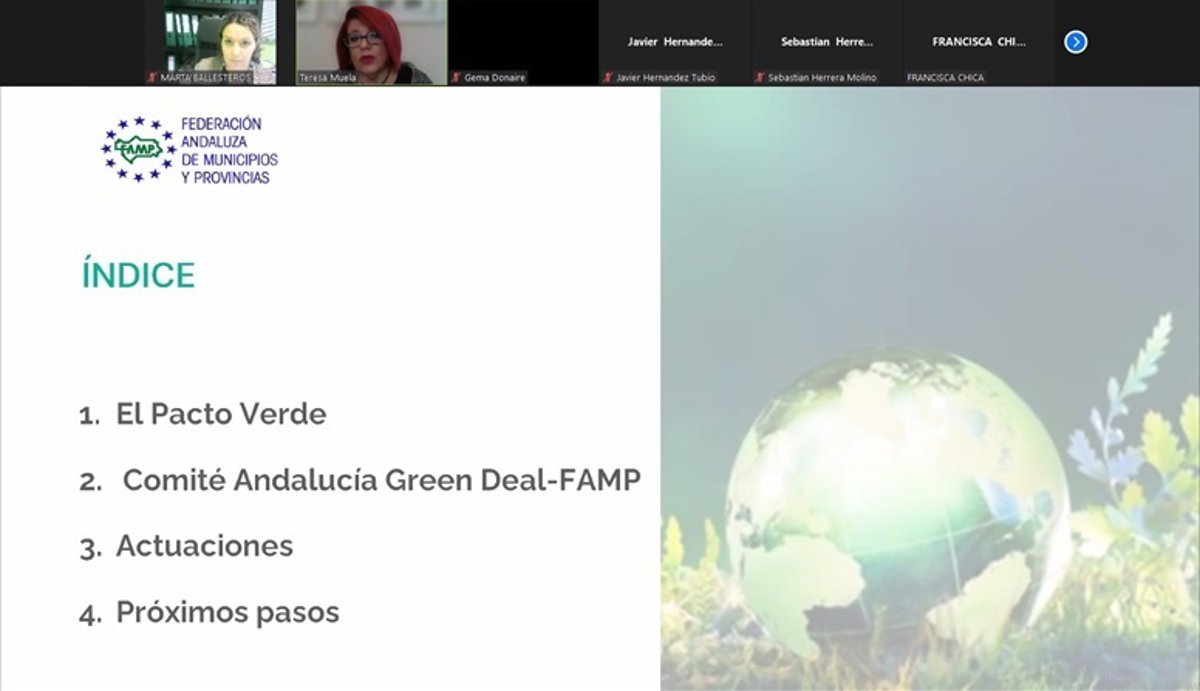 La secretaria general de la Federación Andaluza de Municipios y Provincias (FAMP), Teresa Muela, ha dado a conocer los avances del Comité Andaluz Green Deal de la FAMP, como una apuesta de la Federación para posicionar a las corporaciones locales andaluzas en situación de excelencia para así afrontar los retos del Pacto Verde Europeo y el nuevo marco comunitario 2021-2027.