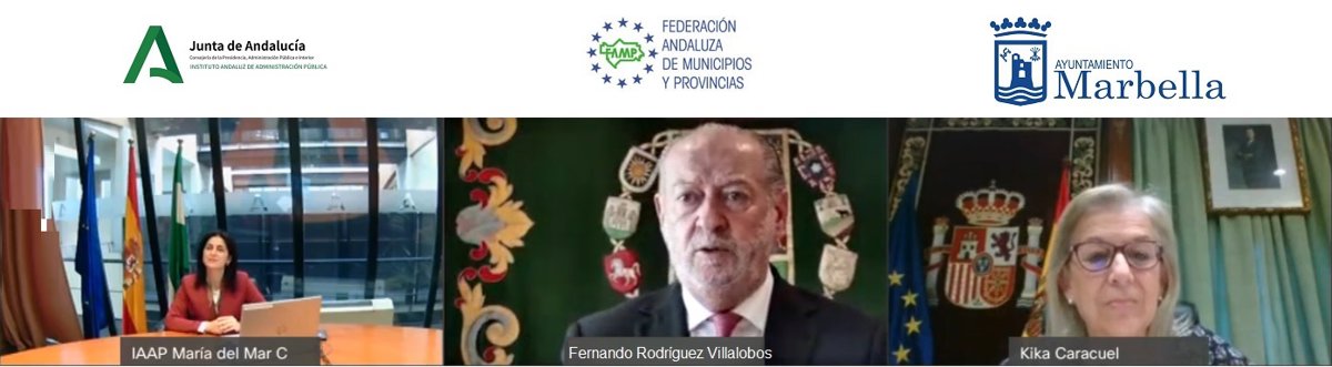 El presidente de la Federación Andaluza de Municipios y Provincias (FAMP) y de la Diputación de Sevilla, Fernando Rodríguez Villalobos; la concejala-delegada de Ordenación del Territorio y Vivienda de Marbella (Málaga), María Francisca Caracuel; y la directora del Instituto Andaluz de Administración Pública (IAAP) de la Junta de Andalucía, María del Mar Caraza; llevaron a cabo el pasado jueves telemáticamente una jornada de Formación Continua que ha tratado sobre "la excelencia en la gestión municipal".