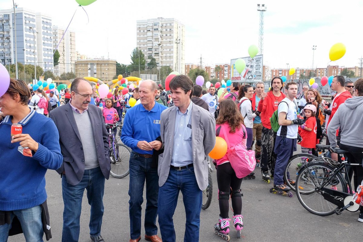 El Ayuntamiento de Sevilla, en colaboración con la Fundación Cajasol y Bike and You, han organizado este domingo el encuentro 'Sevilla sobre ruedas', una actividad en la que han participado unos 3.000 sevillanos que han tomado la salida desde cuatro parques de la ciudad de forma simultánea para encontrarse en el Centro Deportivo San Pablo, donde ha concluido con una fiesta.