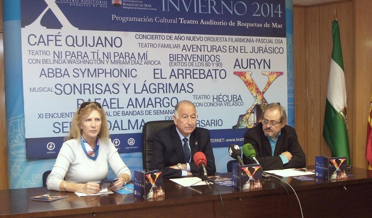 Sergio Dalma, Café Quijano, El Arrebato y Auryn protagonizan la programación de invierno en el décimo aniversario de la inauguración del Teatro Auditorio de Roquetas de Mar (Almería) que ha presentado este jueves el alcalde, Gabriel Amat.