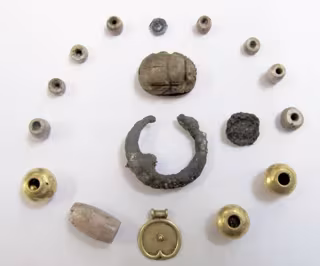 Estas primeras excavaciones han dado distintos ajuares. Entre ellos, un colgante en forma de medalla de plata y una cuenta de cornalina; un collar con cuentas de oro y cornalina, una medalla de oro, un arete de plata, una pequeña pieza de plata sin determinar y un escarabeo de esteatita con sello en escritura jeroglífica. Parece ser que este conjunto estaba "enmarcado" por unos muros de adobe realizados con arcilla rojiza.