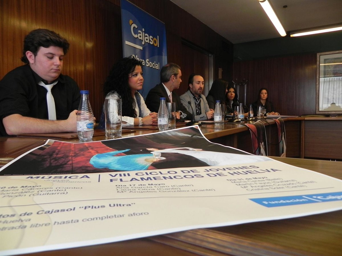 El director territorial de Cajasol en Huelva, José Ángel Hernández; el coordinador del ciclo, Luis Miguel Baeza, y los artistas Ana García Caro, Mari Ángeles González, María Canea, Cristina Soler y Martín Fayos han presentado este martes este certamen con el que Cajasol pretende "difundir el flamenco y dar una oportunidad de promoción a los jóvenes talentos de la provincia", como ya ocurriera, entre otros, a 'Pitingo', Jeromo Segura o Argentina, que en su día pasaron por este certamen.