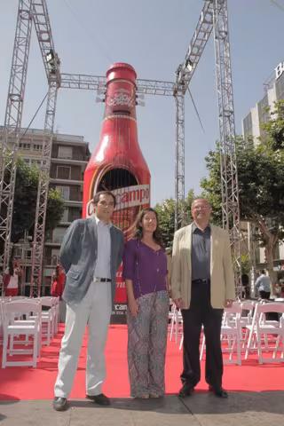 El alcalde de Córdoba, José Antonio Nieto; el concejal de Cultura y presidente del Instituto Municipal de las Artes Escénicas (IMAE), Juan Miguel Moreno Calderón, y la 'sponsoring manager' de Cruzcampo, Ada Bernal, han asistido este lunes, en el Bulevar del Gran Capitán a la inauguración de la 'botella guitarra', de diez metros de altura, que sirve de emblema del XXXIII Festival de la Guitarra de Córdoba, cuyo programa formativo comienza este mismo lunes, mientras que el programa de conciertos comienza este martes.