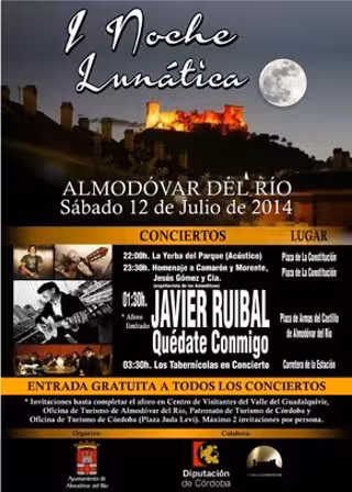 El municipio Almodóvar del Río (Córdoba) celebra este sábado su I Noche Lunática, en la que se van a ofrecer distintos conciertos gratuitos en rincones y plazas de la localidad, siendo el recital del cantautor gaditano Javier Ruibal, que tendrá como escenario el Castillo de Almodóvar, el que más interés ha suscitado, al agotarse las invitaciones a los pocos días de ponerse a disposición del público interesado.
