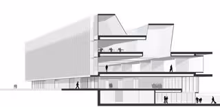 En la fachada del parque habrá un profundo voladizo, que constituye la terraza de la sala de lectura en el nivel +1, y sombreará la fachada del área infantil en los meses de verano.
