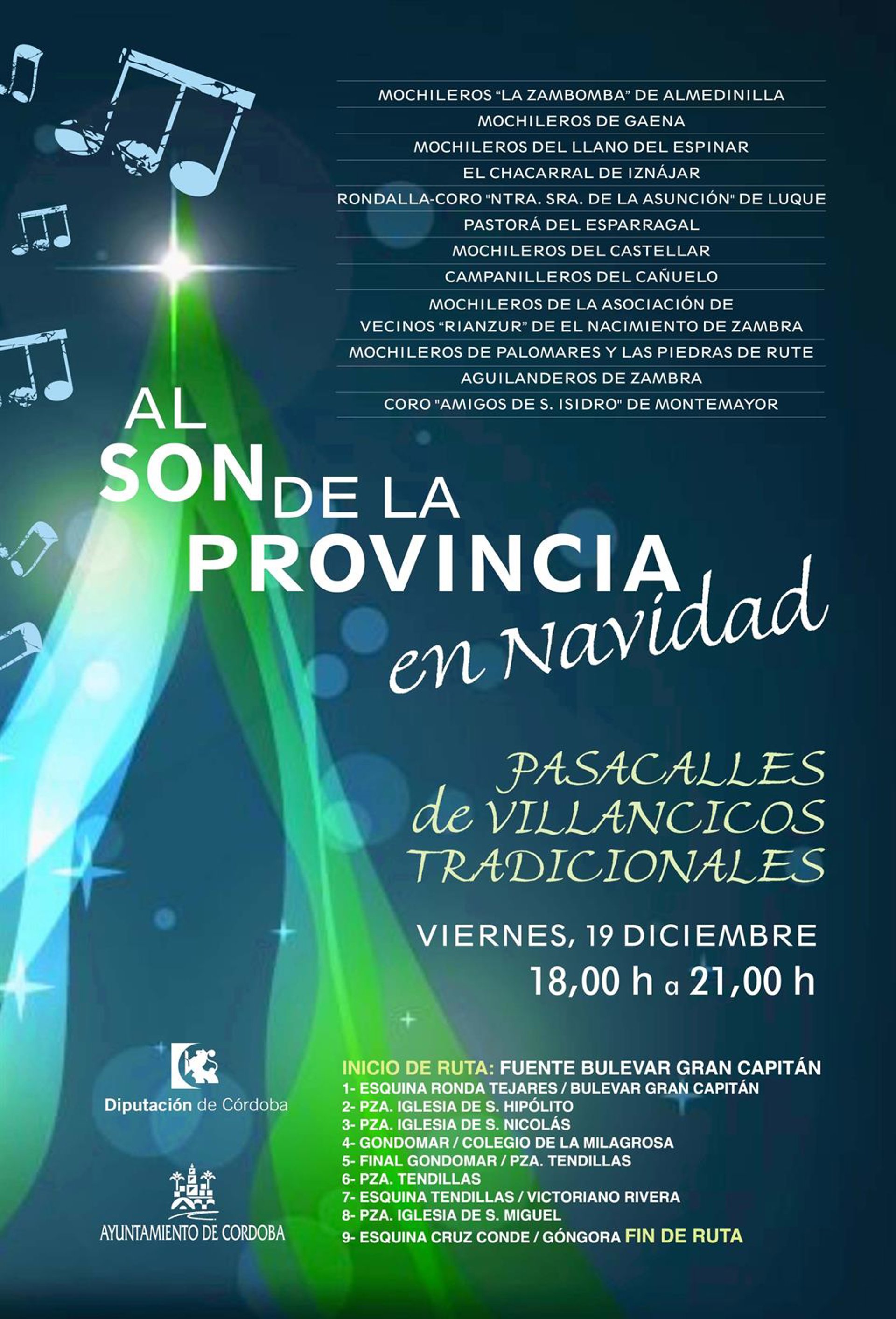 Once grupos de villancicos y campanilleros de Córdoba capital y de la provincia recorren este viernes, a partir de las 18,00 horas, el centro de la ciudad, con el pasacalles de música tradicional navideña 'Al son de la provincia', organizado por la Delegación de Fiestas y Tradiciones Populares del Ayuntamiento y por la Diputación de Córdoba.