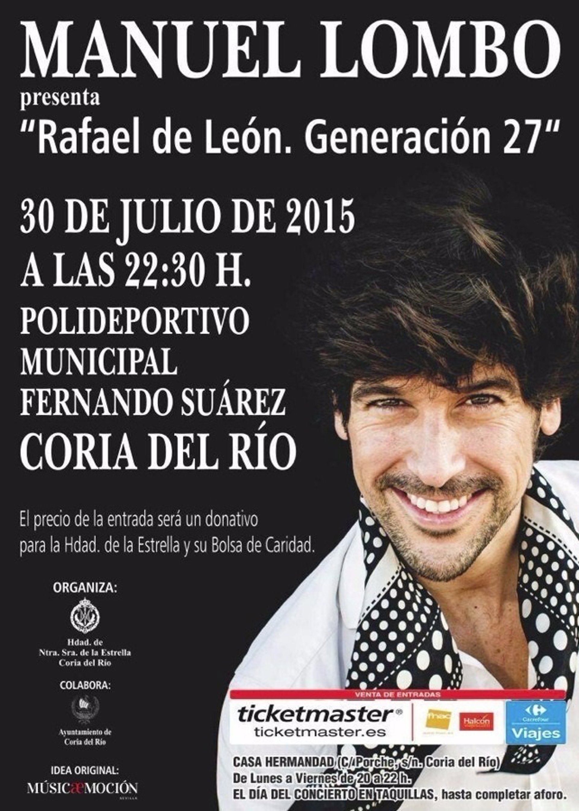 El artista flamenco Manuel Lombo ofrece un concierto extraordinario y benéfico en Coria del Río (Sevilla), según informa el Ayuntamiento. El artista, que presenta 'Rafael de León. Generación 27', actúa el jueves 30 de julio de 2015 a las 22,30 horas en el Polideportivo Municipal Fernando Suárez de la localidad ribereña.