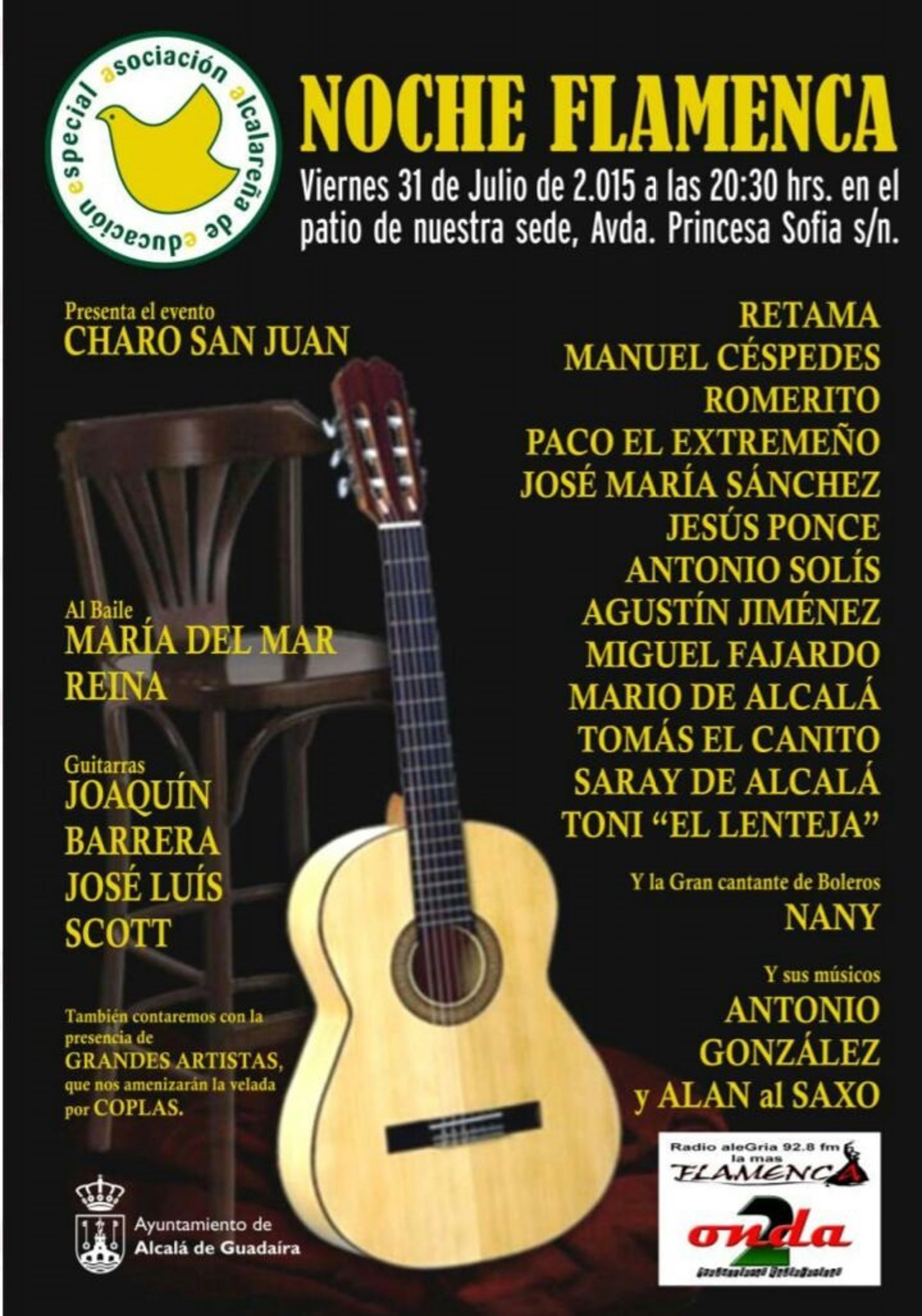 Esta 'Noche Flamenca' de la AAEE contará con la actuación de Retama, Manuel Céspedes, Romerito, Paco el Extremeño, José María Sánchez, Jesús Ponce, Antonio Solís, Agustín Jiménez, Miguel Fajardo, Mario de Alcalá, Tomás el Canito, Saray de Alcalá y Tony 'El Lenteja', acompañados por las guitarras de Joaquín Barrera y José Luis Scott. Al baile estará María del Mar Reina, y además se contará con la cantante de boleros Nany y sus músicos Antonio González y Alan al saxo. Presentado por Charo San Juan, la cita cuenta también con la colaboración de Radio Guadaíra y Onda 2 Radio.