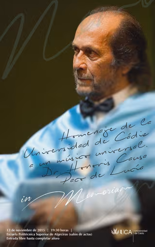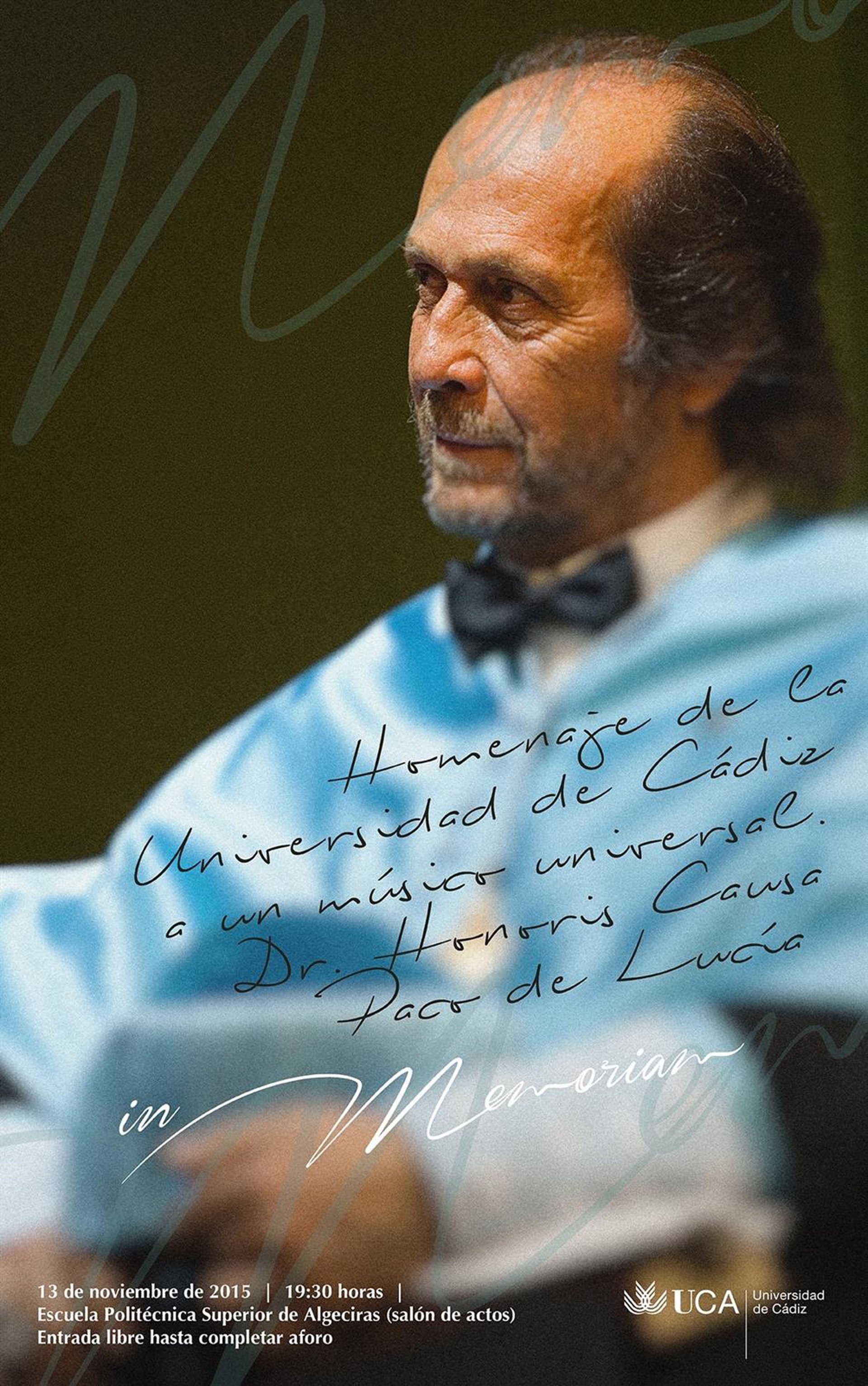 La Universidad de Cádiz (UCA) ha anunciado que el 13 de noviembre celebrará en la Escuela Politécnica de Algeciras un acto abierto a la ciudadanía en homenaje a Paco de Lucía, que fue investido doctor Honoris Causa por la UCA el 23 de marzo de 2007. Según ha detallado, la guitarra, la palabra y el baile recordarán su vida y obra.