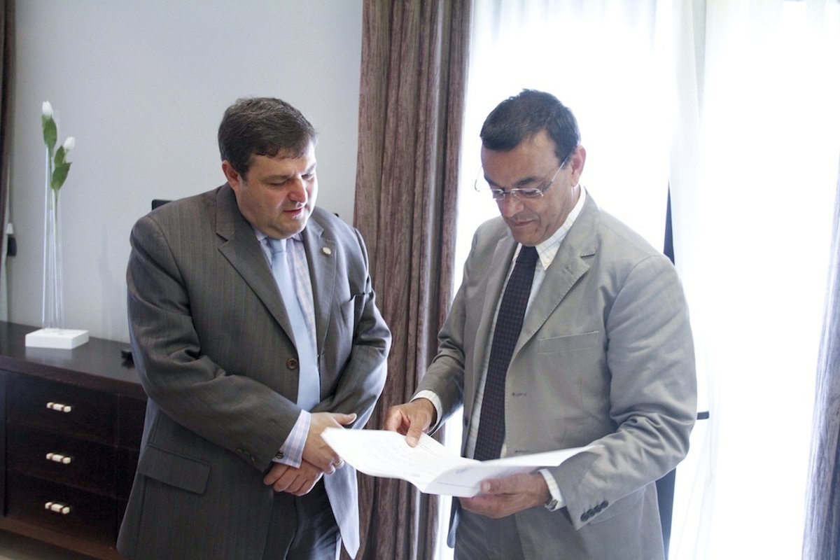 El presidente de la Diputación onubense, Ignacio Caraballo, ha firmado con el rector de la Universidad de Huelva, Francisco José Martínez, el convenio que regula la cesión en depósito de los fondos bibliográficos del servicio de Arqueología de la Diputación Provincial a la Universidad de Huelva.