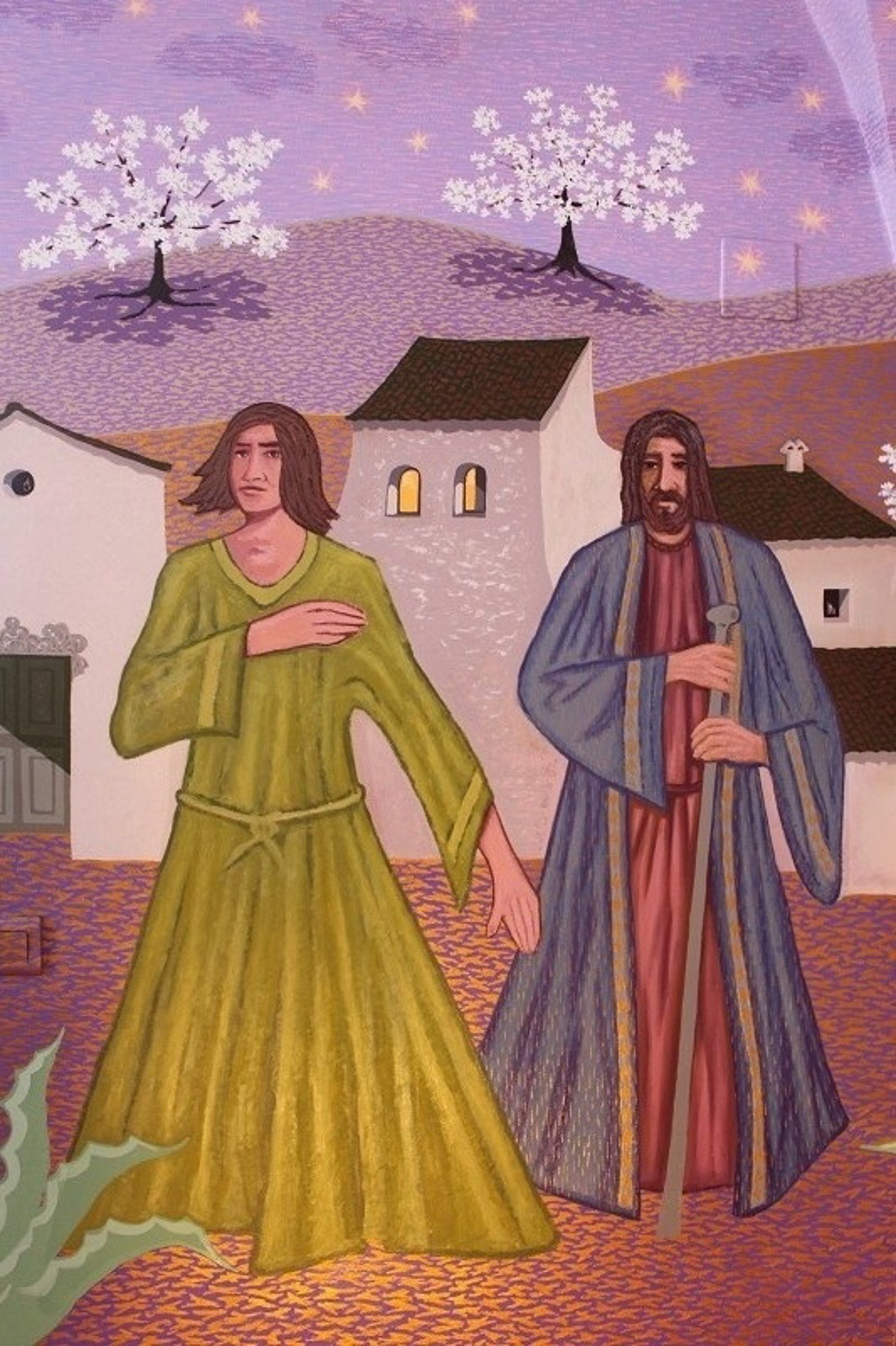 Asimismo, no faltan en los frescos los almendros, olivos y pitas característicos de la pintura de Guerra, ni personajes bíblicos "muy reconocibles" como Simón de Cirene, San Juan, San Pedro o la Virgen María, "que es la Virgen de la Piedad, a la que a su derecha he pintado a la Magdalena y a su izquierda a María de Cleofás", ha dicho.