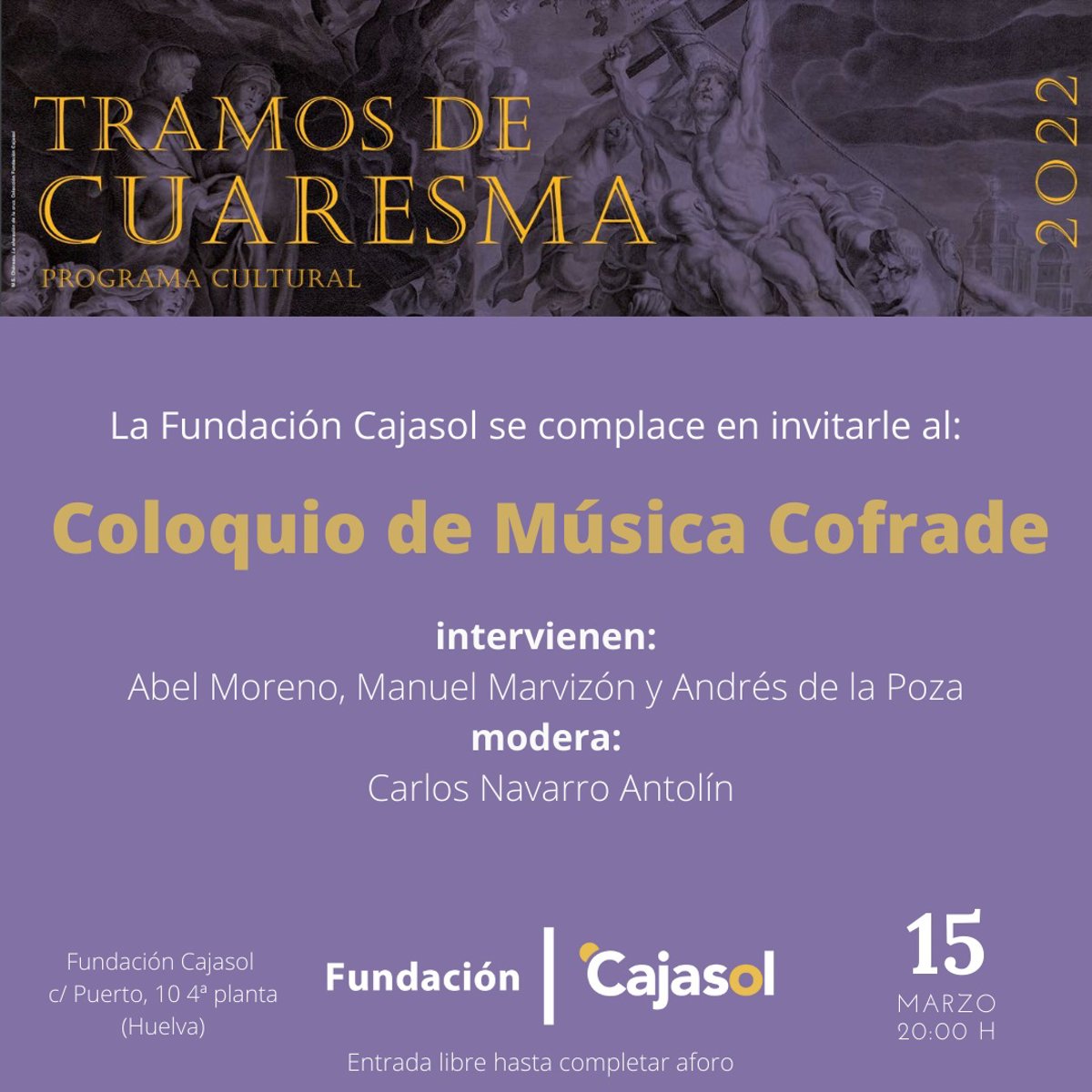 La Fundación Cajasol en Huelva continúa con la programación sobre la Semana Santa con sus 'Tramos de Cuaresma 2022'. De este modo, el martes 15 de marzo, la fundación acoge un coloquio sobre música cofrade a cargo de Abel Moreno, Manuel Marvizón y Andrés de la Poza, que estarán moderados por Carlos Navarro Antolín.