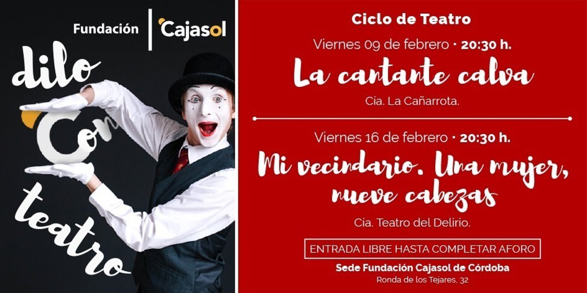 Según ha informado la Fundación Cajasol, este nuevo ciclo de 'Dilo con Teatro' está formado por dos actuaciones: este viernes se representará 'La cantante calva', de la compañía La Cañarrota, y el viernes 16 de febrero se representará 'Mi vecindario. Una mujer, nueve cabezas', de la compañía Teatro del Delirio.