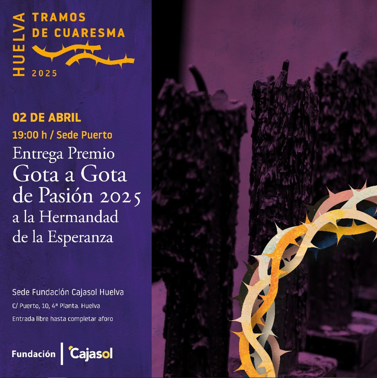 Según ha indicado la entidad en una nota de prensa, este miércoles, 2 de abril, a las 19,00 horas, la sede de la fundación acogerá la entrega del Premio Gota a Gota de Pasión 2025 a la Hermandad de la Esperanza por su obra social 'la Despensa de la Esperanza'. En un acto con elogio de José Antonio Vieira y con la actuación de un cuarteto musical y una saetera. Entrada libre hasta completar aforo.