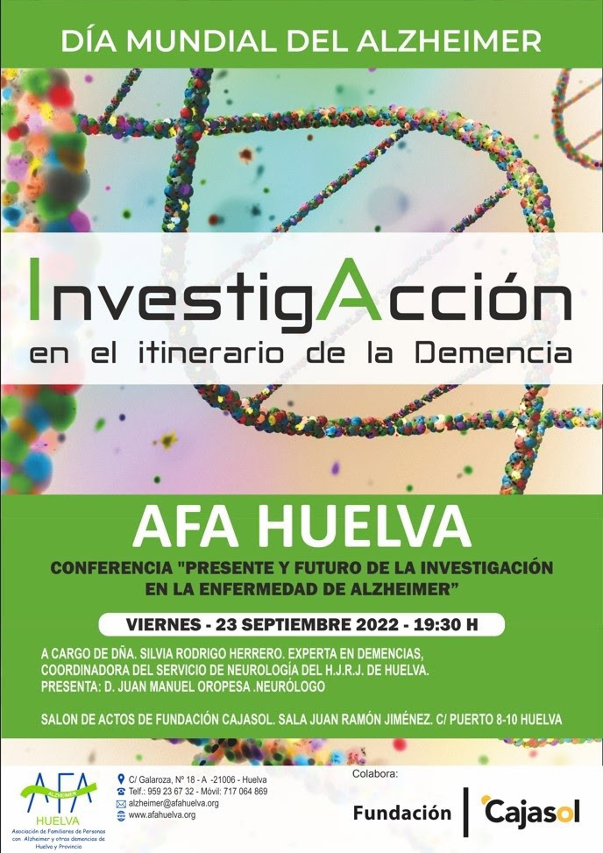 La Fundación Cajasol, se une de la mano de AFA Huelva a los actos con motivo del Día Mundial del Alzheimer. En su vertiente más social, ofrecerá el próximo día 23 de septiembre, la conferencia sobre el presente y el futuro de la investigación de esta enfermedad, con la que muchas familias conviven.