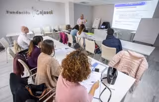 Voluntarios de la Fundación Cajasol han llevado a cabo una nueva sesión de formación en materia de finanzas a integrantes del Programa de Lanzaderas de Empleo de la Fundación Santa María La Real en la provincia de Huelva.