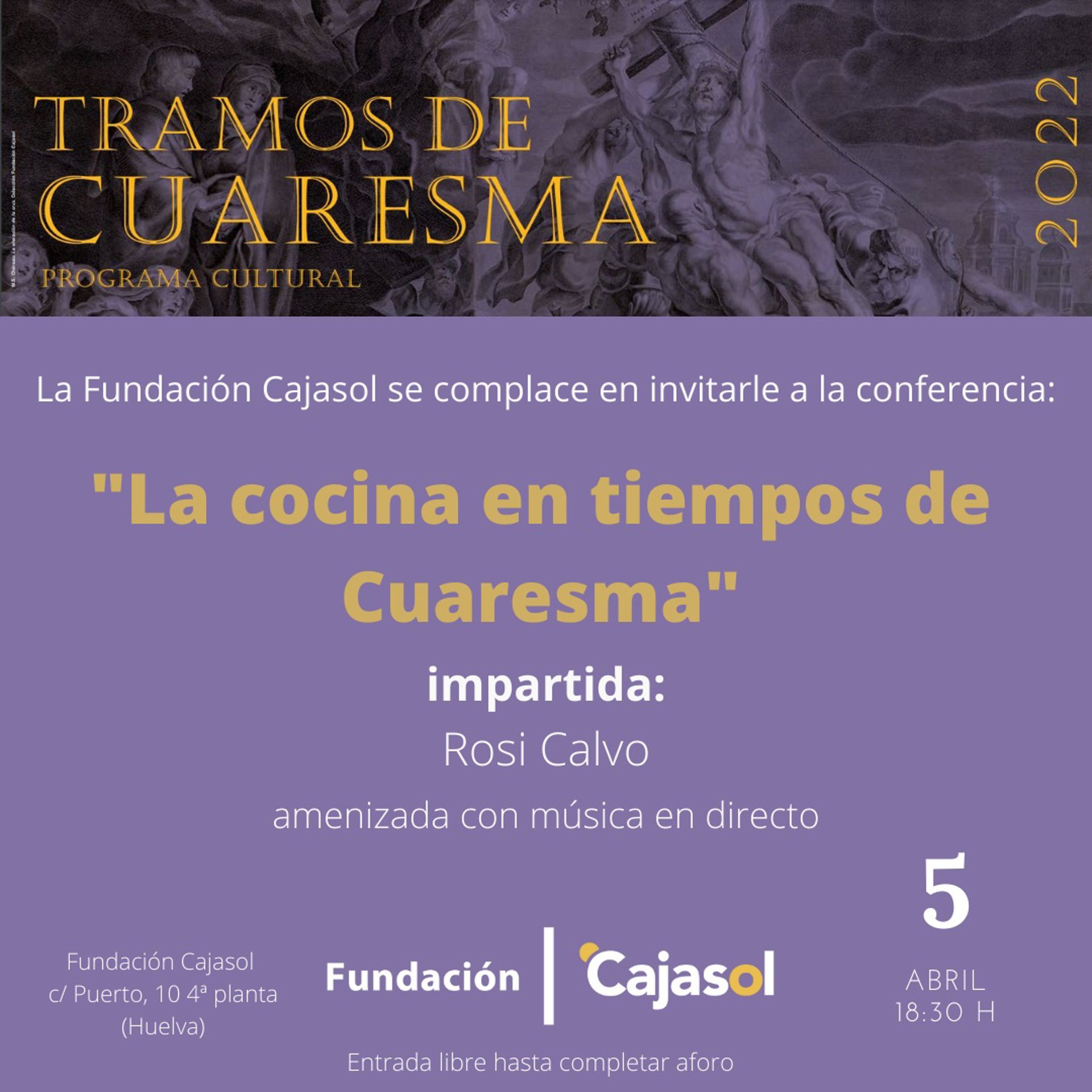 Según ha indicado la entidad en una nota de prensa, este martes la Fundación Cajasol en Huelva acoge la conferencia 'La cocina en tiempos de Cuaresma", que será impartida por Rosi Calvo y amenizada con música en directo. La cita comenzará a las 18,30 horas, en la sede de la Fundación, sita calle Puerto, 10, cuarta planta.