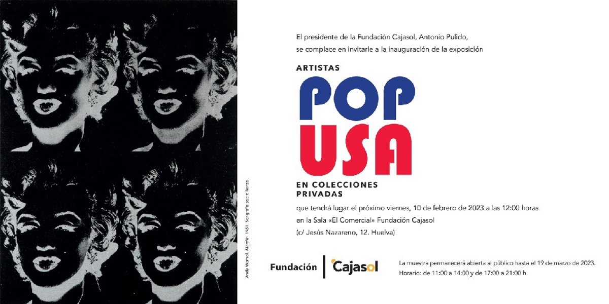 La sala El Comercial de la Fundación Cajasol de Huelva acogerá desde el viernes la exposición POP USA, que se inaugurará a las 12,00 horas, y que expondrá obras de los autores Andy Warhol, Robert Indiana, Robert Rauschenberg y Edward Ruscha, en una muestra comisariada por Pepe Cobo.