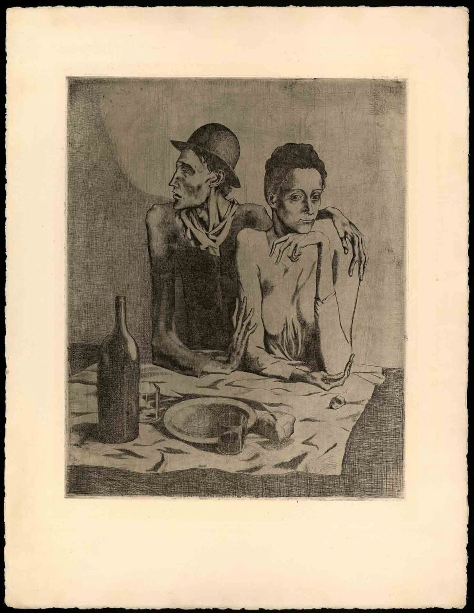 Dentro de esta muestra destacan tres conjuntos temáticos. La 'Suite de los saltimbanquis', obra maestra del joven Picasso grabador, son aguafuertes y puntas secas realizados entre 1904 y 1906, "imágenes plenas de melancolía y compasión, perfecta síntesis de las formas y motivos de las épocas azul y rosa" entre las que se incluye el "conmovedor" grabado 'El almuerzo frugal' (1904).