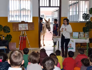 Desde que se pusieron en marcha las actividades con motivo de la celebración del 'Año de Platero', una de las iniciativas que más expectación está despertando entre los pequeños es 'La Visita de Platero'. Los escolares asisten, entre sorprendidos y encantados, a la visita de un burro de verdad cargado de libros que les acompaña mientras se desarrolla la actividad de fomento de la lectura.