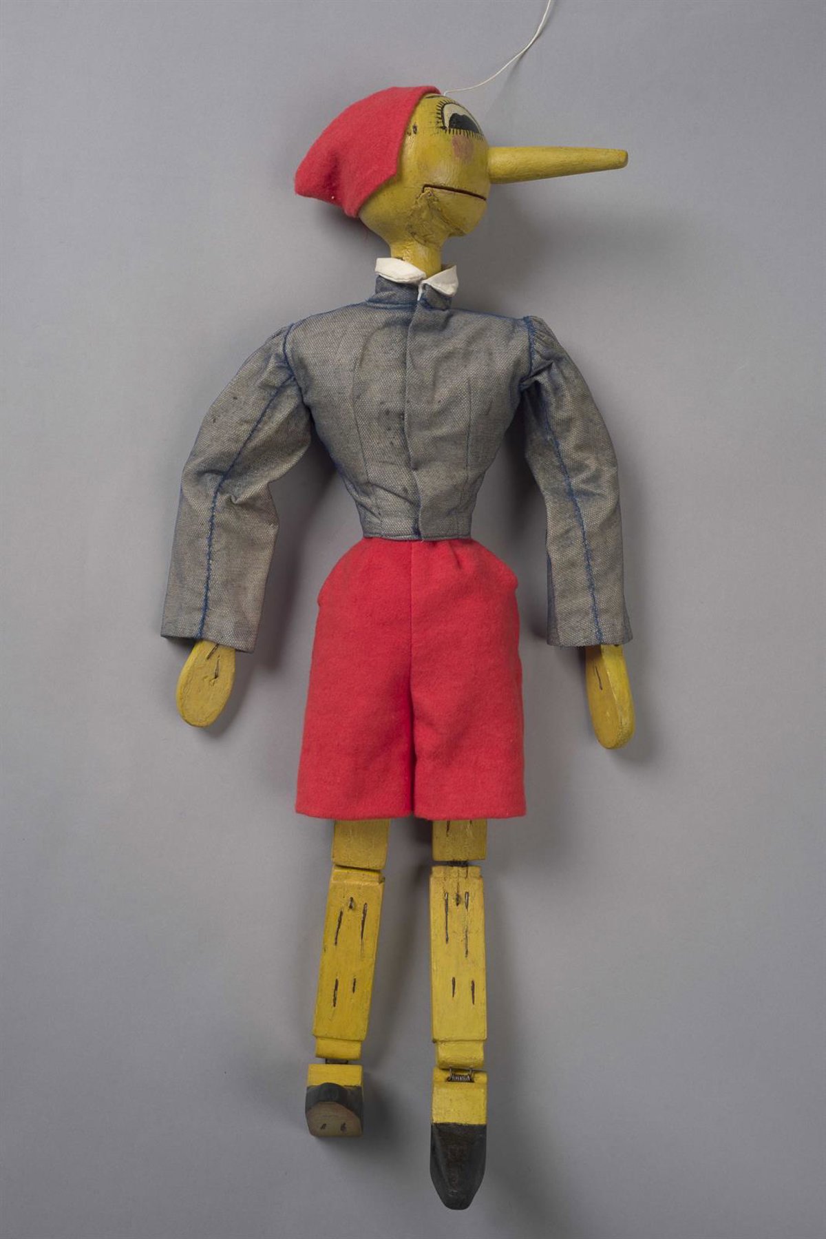 El títere 'Pinocho' es una pieza de 65 centímetros de altura, articulado y realizado en madera, metal y cartón piedra. La obra, pintada al temple y de vestir, formaba parte de la colección del Teatro de Títeres de la Tía Norica.