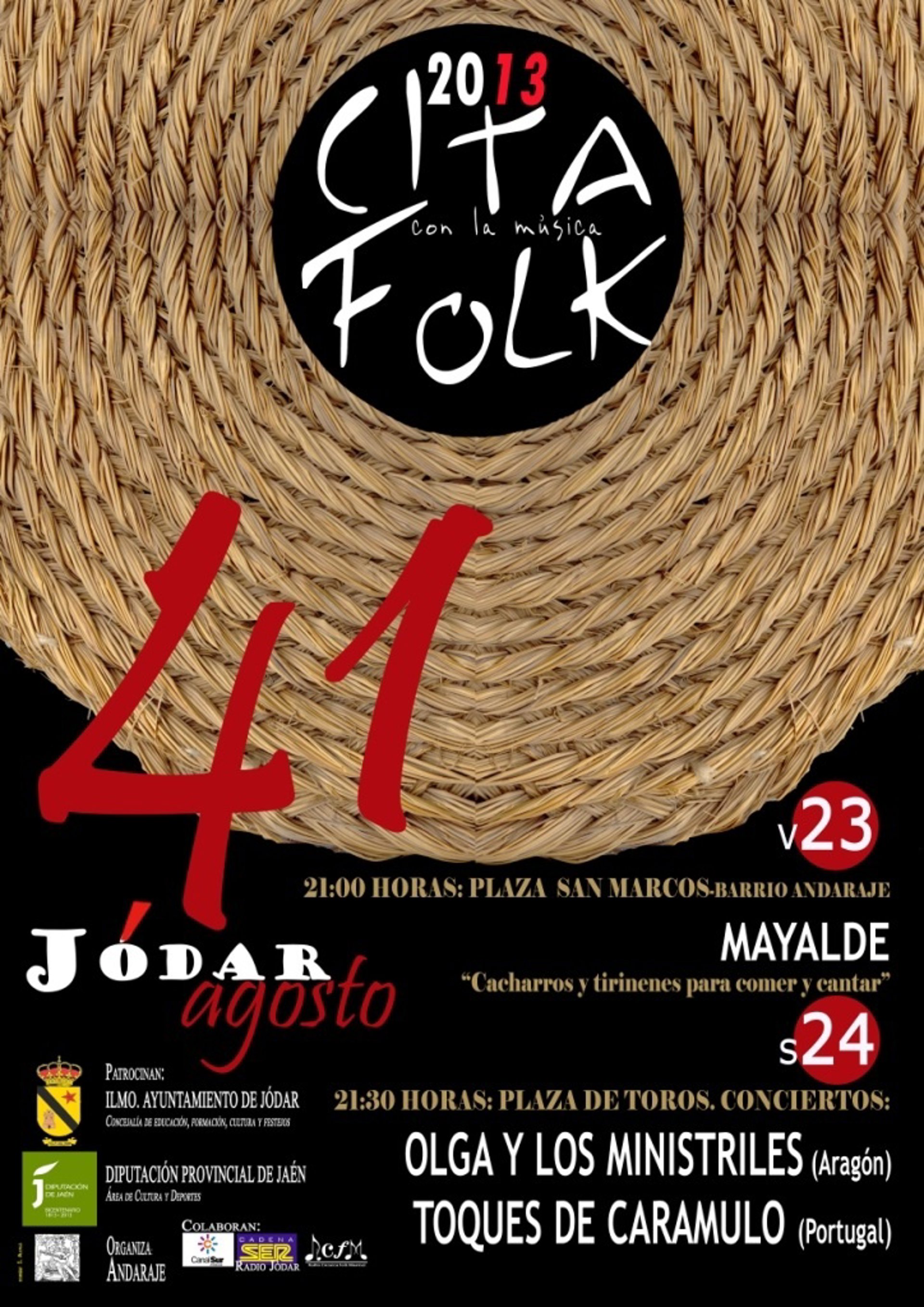 La localidad jiennense de Jódar acoge estos viernes y sábado la cuadragésimo primera edición de su Cita con la Música Folk. Convertido en el certamen de este género "más veterano del sur de Europa", su programación incluye este año tres conciertos "de primer nivel", los de Mayalde, Olga y los Ministriles y Toques de Caramulo.