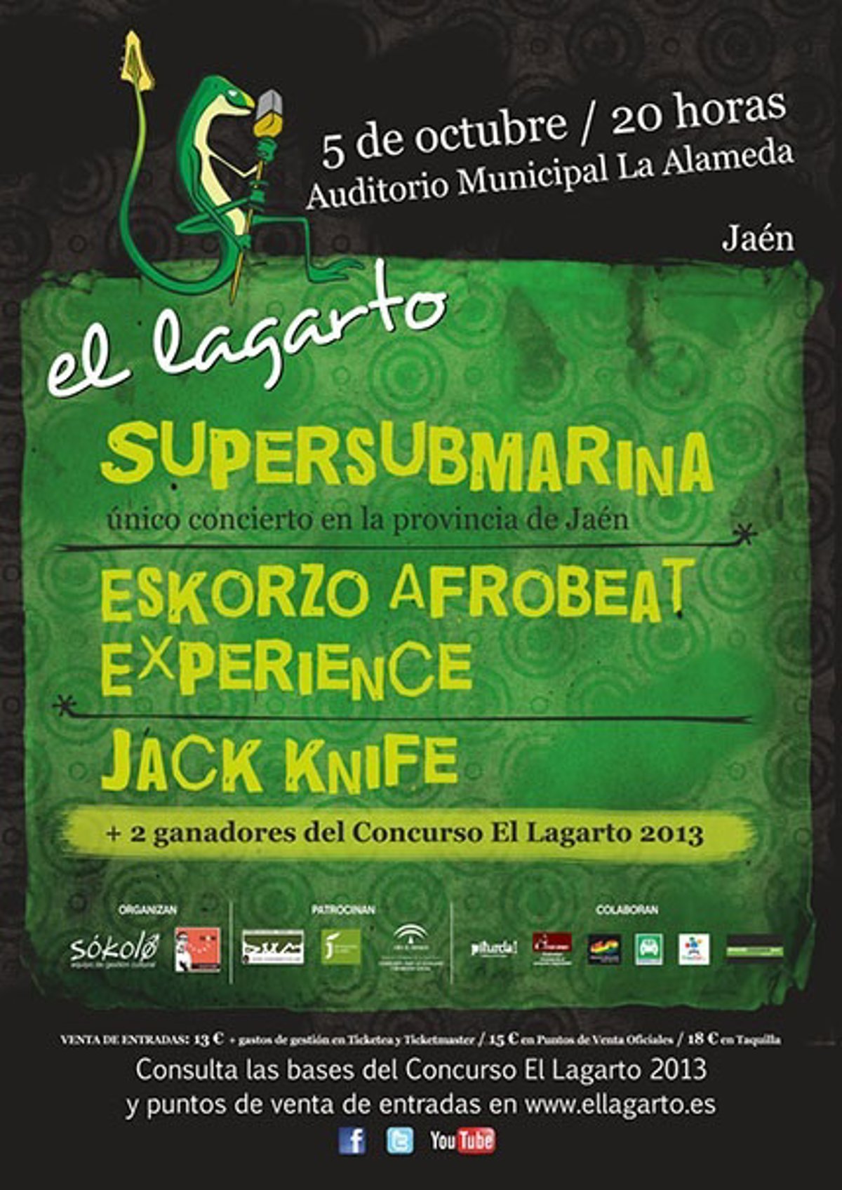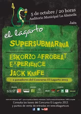 Toda la información de El Lagarto 2013, así como las bases del concurso pueden consultarse en la página web www.lagarto.es, donde también se recogen los puntos de venta de entradas, que tienen un precio de 15 euros en anticipada (también se pueden adquirir en las plataformas Ticketea y Ticketmaster) y 18 euros en taquilla.