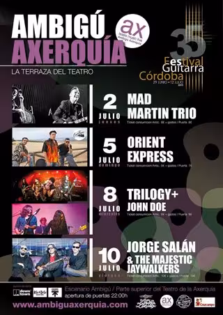 La Sala Ambigú Axerquía, en la capital cordobesa, como ya hiciera el año pasado, ha acogido este mes de julio una serie de conciertos paralelos al Festival de la Guitarra de Córdoba, con artistas "de mucha calidad" que ya han actuado, como Mad Martin Trío, Orient Express y Trilogy, pero será Jorge Salán el que cierre este diclo este viernes en la terraza de esta sala de conciertos, ubicada en la parte superior del Teatro de la Axerquía.