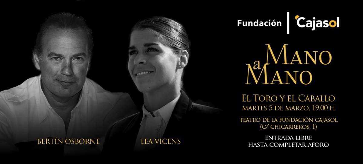 La nueva entrega del ciclo 'Mano a mano' de la Fundación Cajasol tendrá como protagonistas a la rejoneadora Lea Vicens y al cantante y presentador Bertín Osborne. Ambos abordarán el tema 'El toro y el caballo', que será el punto de partida de este encuentro, el número 53 de un ciclo que se celebra en Sevilla desde 2007.