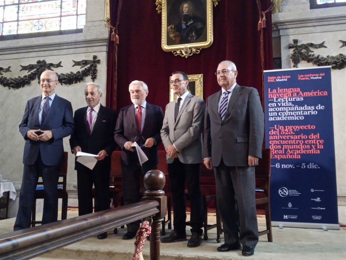 El ciclo de lecturas 'La lengua navega a América' será una de las actividades programadas para el 525º Aniversario del Encuentro entre dos Mundos. Se trata de un proyecto cultural que la Real Academia Española (RAE), la Autoridad Portuoria de Huelva, la Diputación de Huelva, La Fundación Cajasol, la Fundación Caja Rural del Sur y la Fundación Atlantic Copper han impulsado aunando intereses y que se traducirá en un ciclo de lecturas "en vivo" auspiciado por la RAE bajo la creación y dirección del actor, académico y director de escena José Luis Gómez.