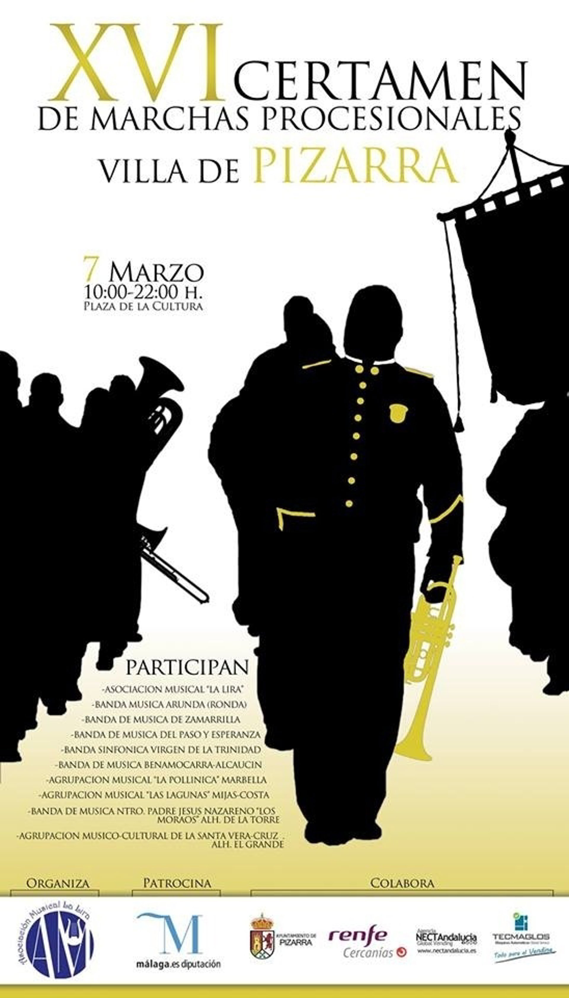 El municipio malagueño de Pizarra se prepara para acoger este sábado el XVI Certamen de Marchas Procesionales, en el que participarán más de 800 músicos pertenecientes a 10 bandas de distintos puntos de la provincia.