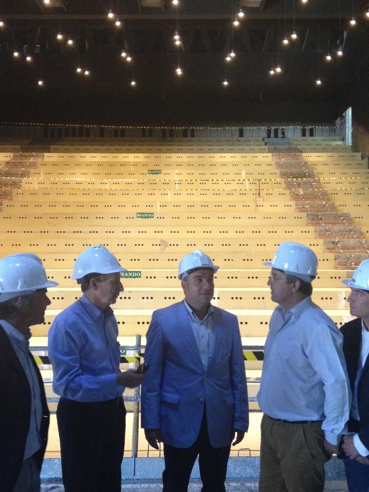 Bendodo ha comprobado el avance de los trabajos acompañado del alcalde de la localidad, José María García Urbano, y diferentes colectivos vecinales. Actualmente la empresa adjudicataria, Sando, está a punto de instalar los equipamientos técnicos del escenario y las gradas, tras lo que acometerá la colocación de la solería.