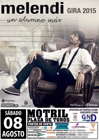 Melendi ofrecerá un concierto el próximo día 8 de agosto en la Plaza de Toros de Motril (Granada) a las 22,30 horas de la mano de la empresa 'Granada No Duerme' y con un precio de entre 30 y 40 euros más gastos de gestión, volviendo así a actuar en la ciudad costera ocho años después de que formara parte del cartel del festival 'Son de Azúcar'.