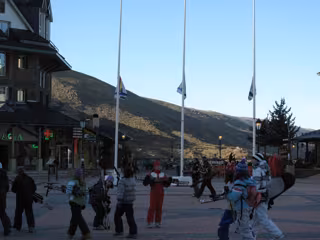 Las banderas de la Universiada Granada 2015 ondean este martes a media asta en la Plaza de Andalucía de Pradollano de la estación de esquí de Sierra Nevada en recuerdo del cantaor granadino Enrique Morente, fallecido el lunes en Madrid a los 67 años.