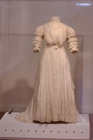 El original es un vestido de tarde con cola corta, realizado en seda natural y encaje de Alençon, en color marfil. Data de 1890 y ha sido restaurado por el diseñador de moda Ángel Palazuelos, que ha realizado una labor de limpieza, consolidación y adecuación de los tejidos y encajes originales.