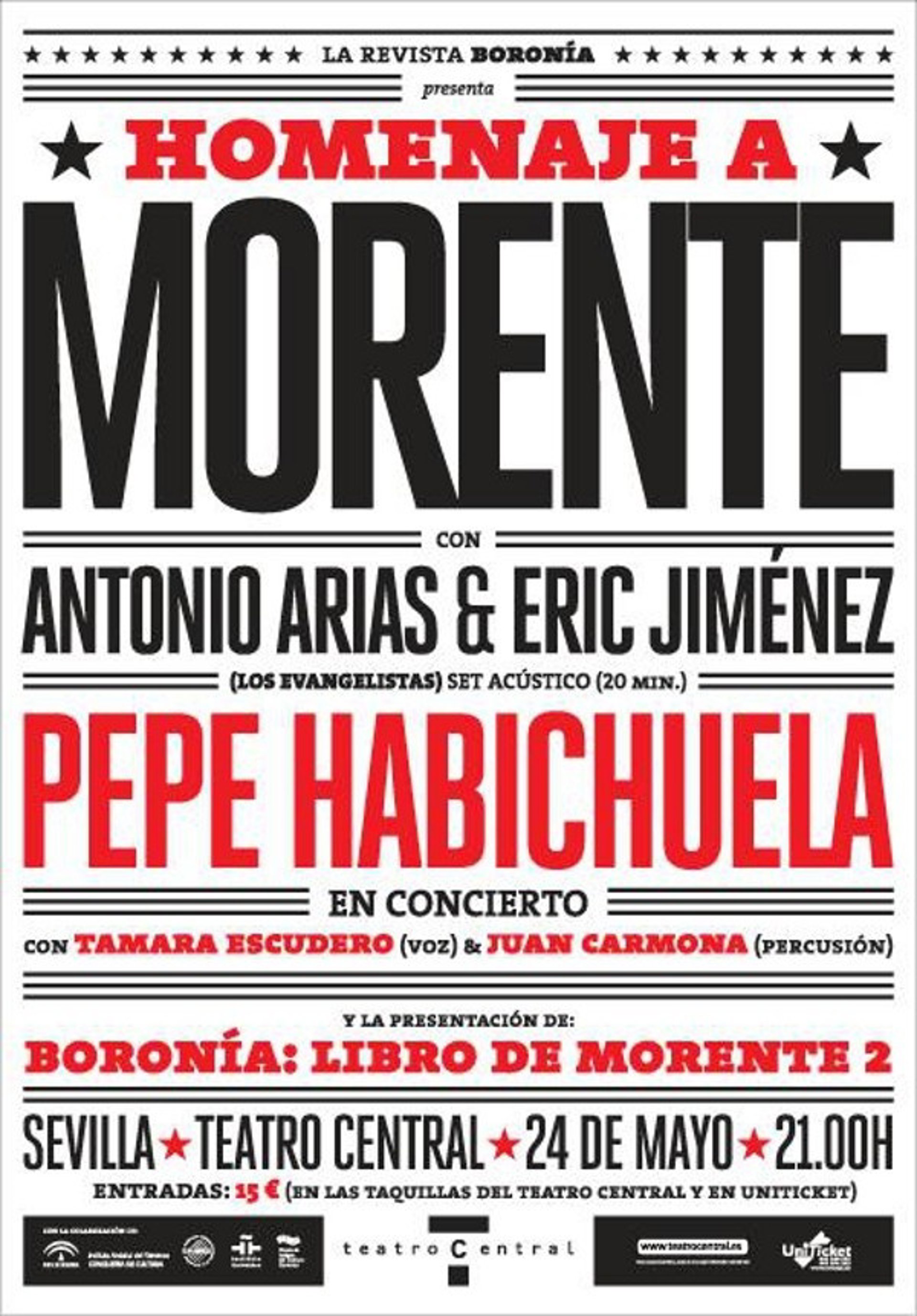 El homenaje consistirá en un recital que está dividido en dos partes: la primera, un acústico de Los Evangelistas a cargo de Antonio Arias y Eric Jiménez, con una duración de unos 20 minutos, y una segunda en la que actúa Pepe Habichuela, que durante una hora deleitará al público del Central, acompañado sobre el escenario de Tamara Escudero y Juan Carmona a la voz y percusión, respectivamente.