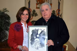 Martel, por su parte, ha agradecido al pintor el haber aceptado el ofrecimiento de la Delegación del Gobierno para dibujar la felicitación de este año: "es un honor para nosotros que los malagueños puedan tener junto a ellos en estas fiestas un dibujo de un artista de la talla y del reconocimiento de Chicano".