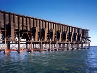 El embarcadero tiene una longitud de 108 metros y se construyó para permitir que los barcos se cargaran por gravedad a partir de las grandes tolvas replegadas en sus laterales. Esta constituido por una estructura de acero laminado muy tupida conseguida con piezas proporcionalmente muy ligeras de sección enlazadas mediante roblones según una disposición en celosía.