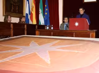La Consejera de Cultura de la Junta de Andalucía, Rosa Torres, junto al alcalde de Carmona, Antonio Cano, presentaron hoy la "compleja" restauración del Estandarte Real de Carmona, del que solo se conserva un 10 por ciento del original, llevada a cabo por el Instituto Andaluz del Patrimonio Histórico (IAPH).