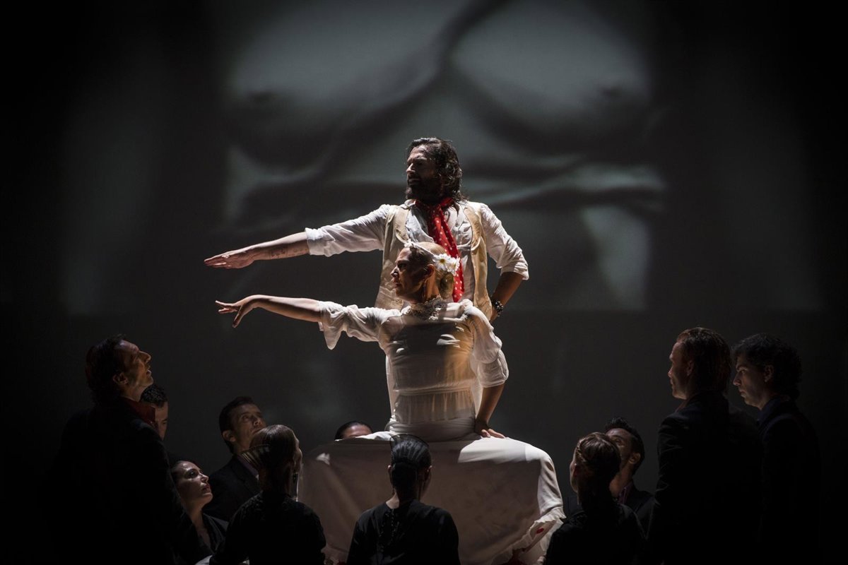 El bailarín Rafael Amargo, junto al actor Manuel Salas, protagoniza el espectáculo teatral y flamenco 'Piedras preciosas', sobre los años que el artista Jean Cocteau pasó en el municipio malagueño de Marbella.