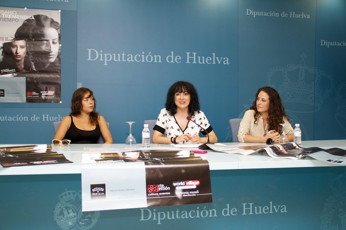 La diputada de Cultura en la Diputación de Huelva, Elena Tobar, junto a la cantaora Rosario 'La Tremendita' y la bailaora, Premio Nacional de Danza, Rocío Molina, han presentado este jueves el espectáculo 'Tiempo', que la cantaora traerá este sábado al Foro Iberoamericano de la Rábida, el cual contará con la presencia sobre el escenario de 14 músicos y con la colaboración de la citada bailaora.