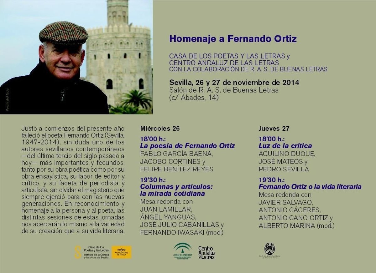La Consejería de Educación, Cultura y Deporte, a través del Centro Andaluz de las Letras, junto con la Casa de los Poetas y las Letras del Ayuntamiento de Sevilla organizan un homenaje al poeta sevillano Fernando Ortiz, fallecido el pasado mes de enero, durante los días 26 y 27 de noviembre en la Academia Sevillana de Buenas Letras, con la participación de un nutrido grupo de destacados poetas y especialistas de Andalucía en diversas sesiones de ponencias, mesas redondas y lecturas.