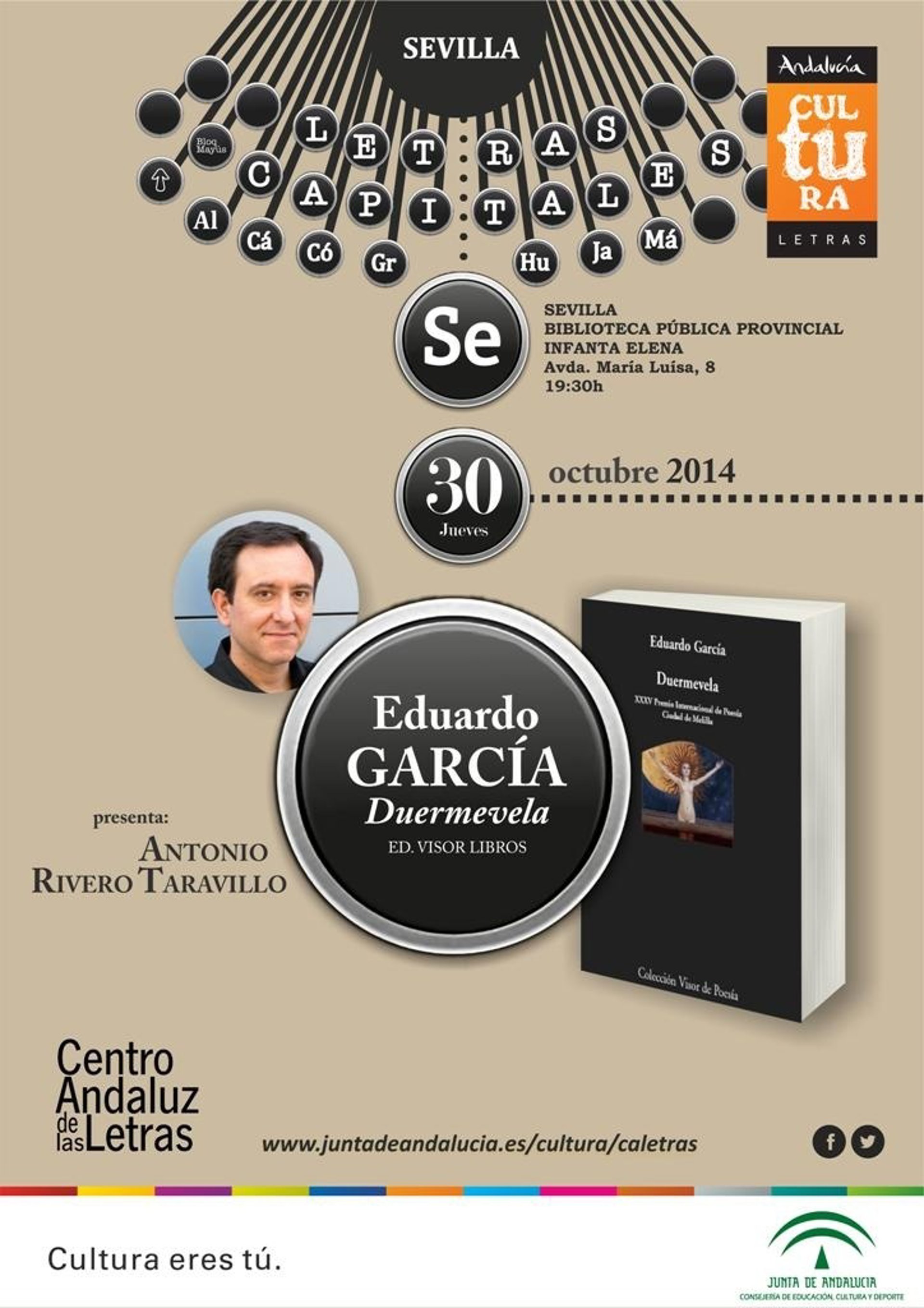 La Consejería de Educación, Cultura y Deporte, a través del Centro Andaluz de las Letras (CAL), prosigue desarrollando el programa de actividades 'Letras Capitales' en Sevilla. Este jueves 30 de octubre, el poeta Eduardo García presentará su nuevo poemario, 'Duermevela', galardonado con el XXXV Premio Internacional de Poesía Ciudad de Melilla y publicado por la editorial Visor Libros. El encuentro, que será en la Biblioteca Pública Provincial Infanta Elena a las 19,30 horas, contará con la intervención del poeta y traductor Antonio Rivero Taravillo.