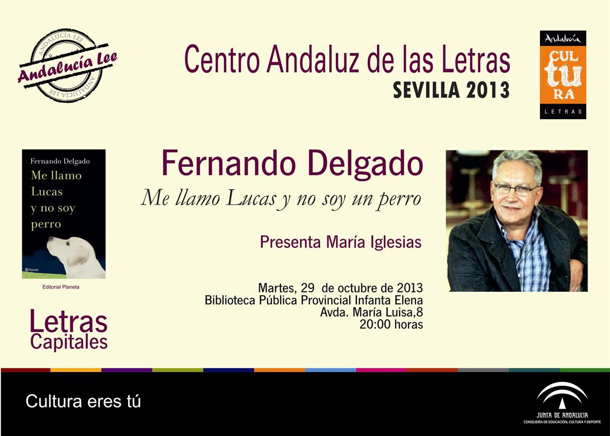 La Consejería de Educación, Cultura y Deporte, a través del Centro Andaluz de las Letras (CAL), continúa el programa de actividades 'Letras Capitales' en Sevilla este martes 29 de octubre con la presentación de la nueva novela del escritor y periodista Fernando Delgado, 'Me llamo Lucas y no soy un perro', publicado por la editorial Planeta. El encuentro será en la Biblioteca Pública Provincial Infanta Elena a las 20,00 horas, y contará con la intervención de la periodista María Iglesias.